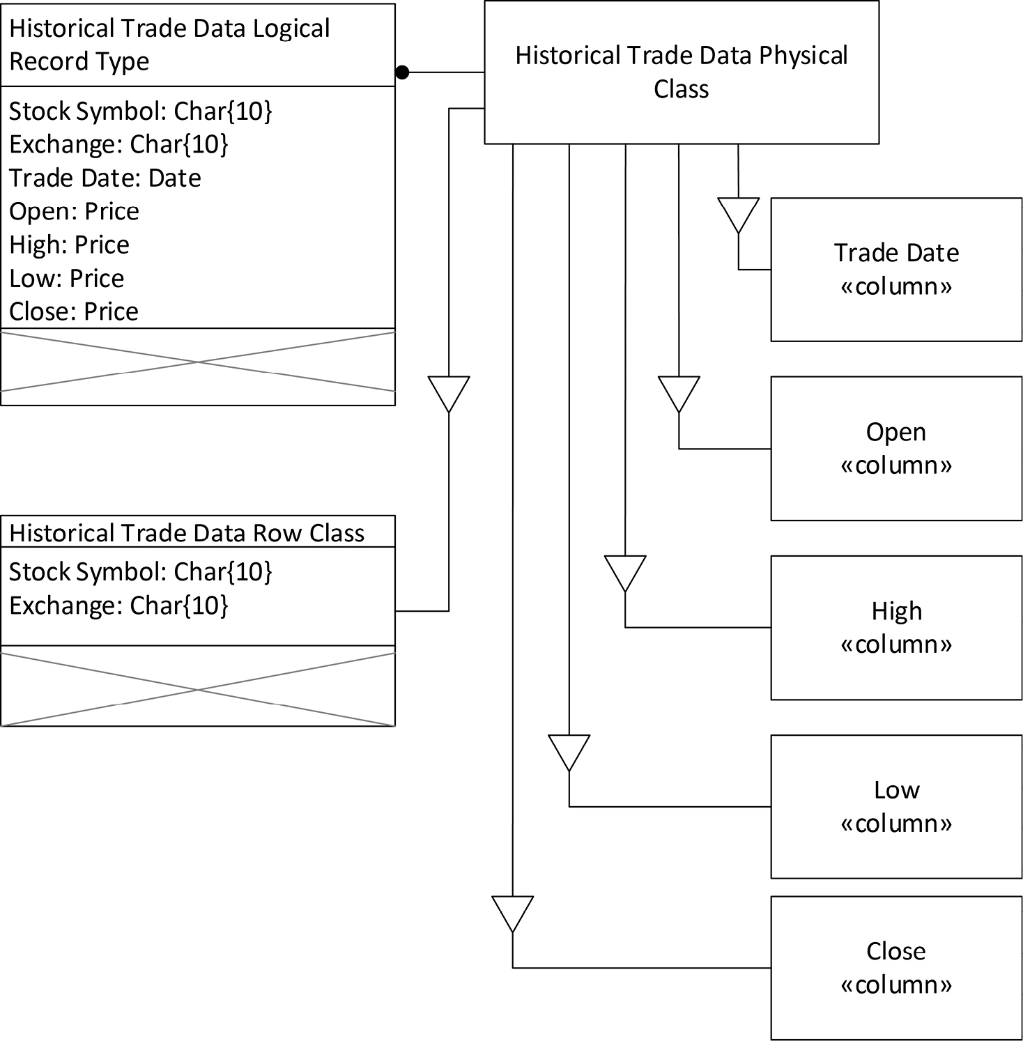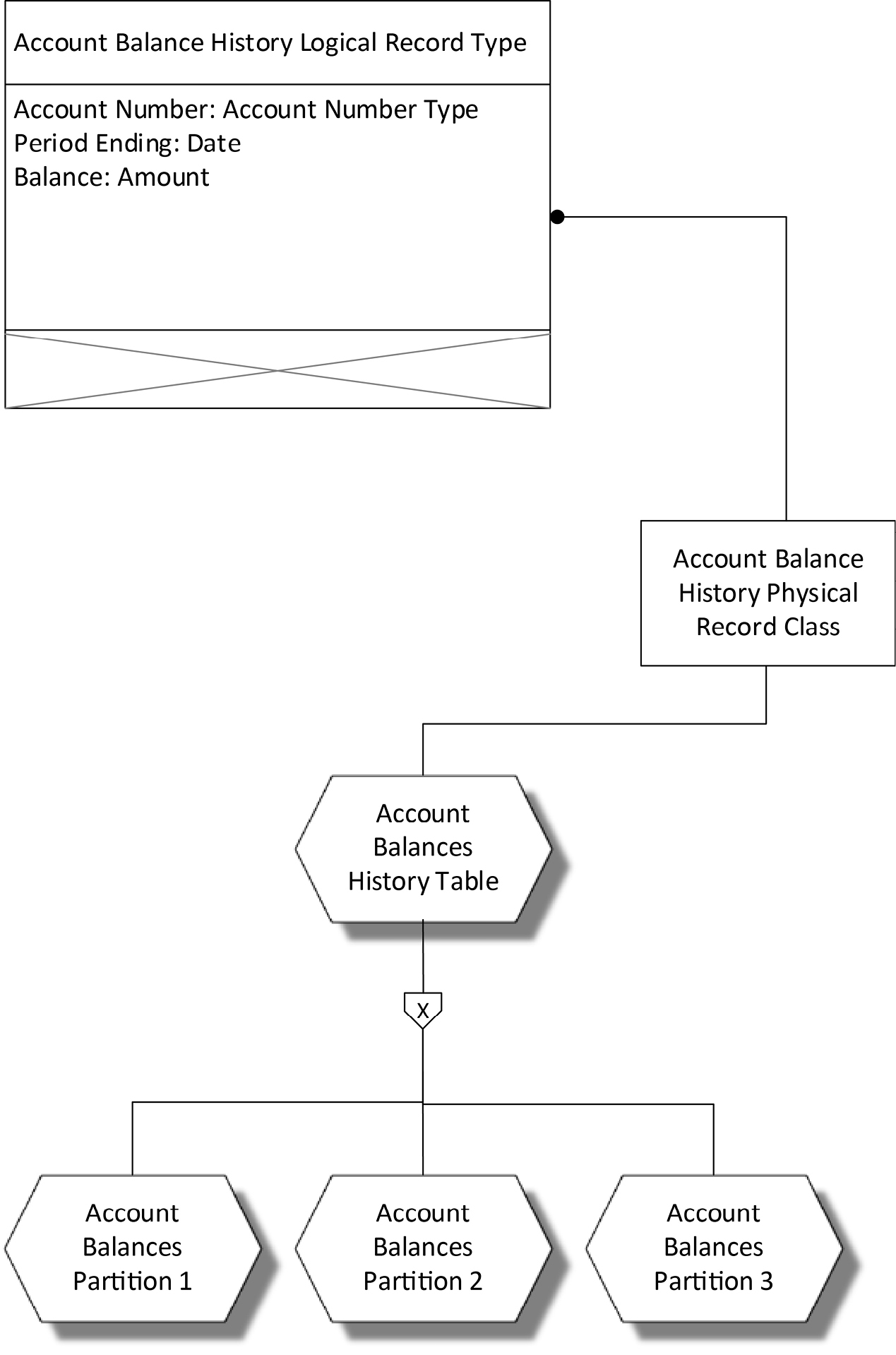 Foreign key constraints were covered in depth in chapter 15. A physical design illustrating foreign key constraints would use the same symbols but solid outlines to connote physical classes implemented by the DBMS, rather than the dashed outlines used in logical data design. The only new thing to consider is how to model partitioning a table by rows—so-called horizontal partitioning. Each partition can be thought of as a table in its own right, containing a subset of the data. The subset is usually defined by some restriction on the data based on a value found in the data, such as a date. Figure 17-5 illustrates a horizontally partitioned row-oriented table.