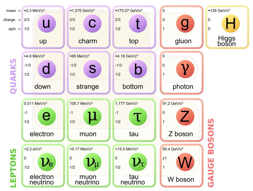 At the current limits of scientific knowledge of the universe, we believe that all matter consists of so-called elementary particles, which come in a relatively small number of types. (See Figure 2-1.) We call them elementary because, as far as we know, they aren’t composed of anything else. All other matter is composed of them. An electron is an elementary particle. Protons and neutrons are composed of the elementary particles called quarks. If a relatively fixed number of electrons, protons, and neutrons remain in a relatively static relationship to each other—protons and neutrons bound together in a nucleus, and electrons orbiting the nucleus—we have what we call an atom. We call atoms that are bound to each other in certain spatial relationships molecules. Molecules can get quite large, and can form, among other things, minerals, proteins and other raw materials of living things, and, very simply, everything that we can see or touch.
