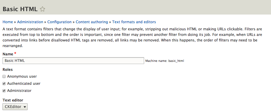 Text formats are first configured by giving them a display Name that can be selected when creating formatted content or when adding text (formatted) fields to content types.