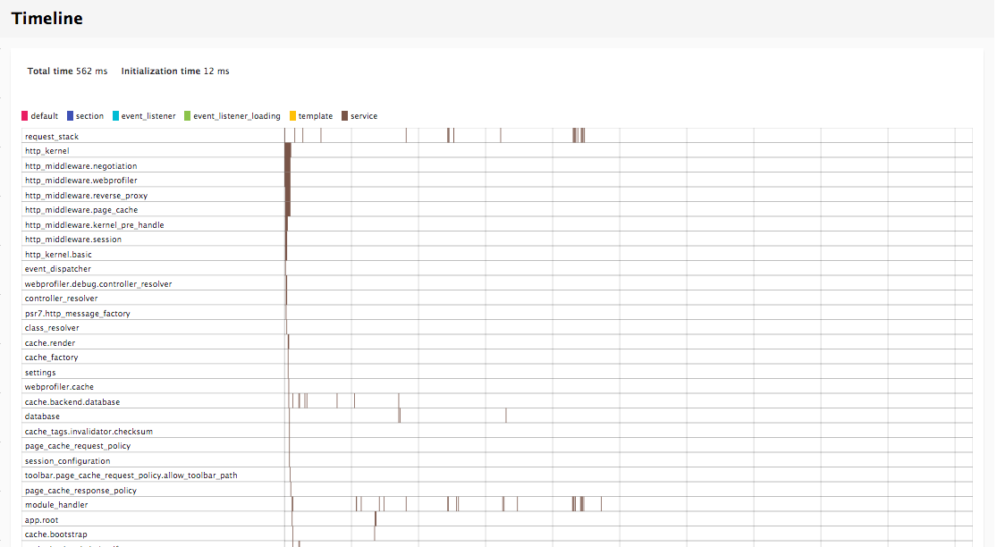 From the URL detail page, the third tab shows a waterfall view of the how the page is built. This waterfall is similar to the one found in the DevTools in Google Chrome or the profiler in Firefox. The visualization shows the order in which the controllers, events, templates, and so on are executed, as well as how long they take to compile and run, and how much memory is being used at each step.