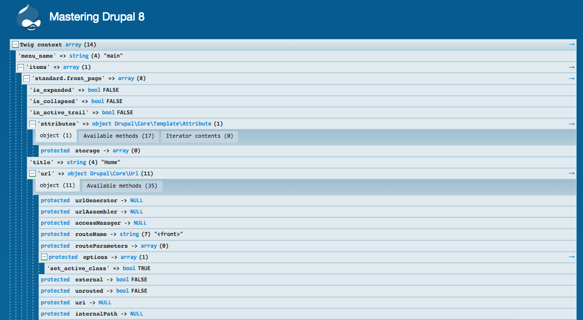 Turning on Twig debugging also enables some additional functions inside the Twig templates. Inside a Twig template, you can place {{ dump(var) }} to output the value of a given variable. If you have the Kint submodule from the Devel module enabled, you can also place {{ kint() }} in your template, which will display the full context available to the template, all variables, and theme hook suggestions.