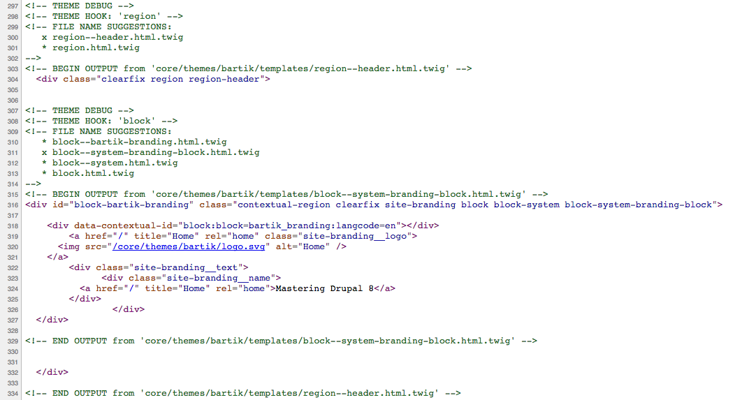 The Twig engine provides a number of options to assist with debugging. Enabling overall debugging adds comments around each Twig template, showing the theme hook and any template suggestions: