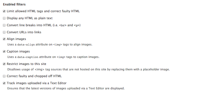 Depending on how restrictive or how loosely we want to control HTML will determine which filters we enable.