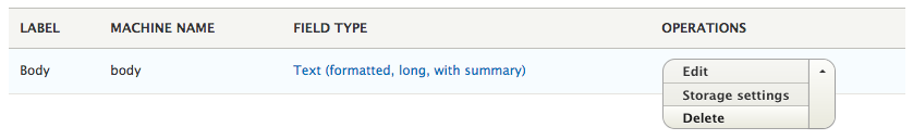 Deleting a field using the Field UI only requires that the field is not being reused across multiple content types and that the field has no data stored in it. Since this is a new instance of our Post content type, we can delete the Body field by selecting Delete from the drop-down button next to the field name: