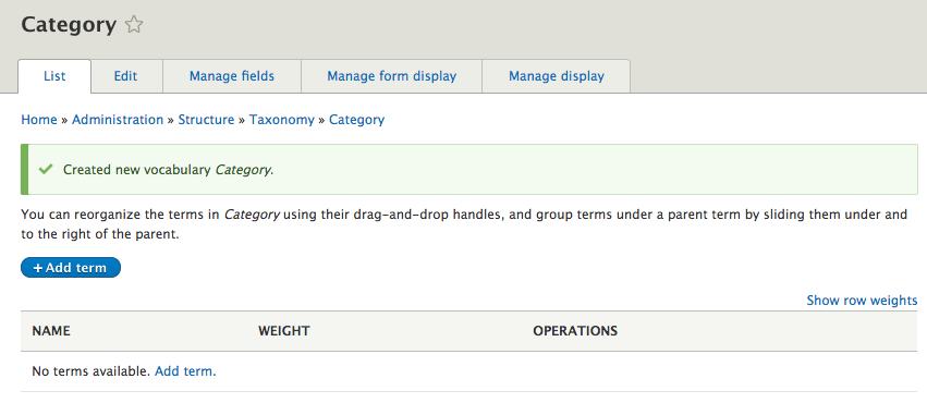 We can now click on the Save button to complete adding our new Taxonomy vocabulary called Category. Like content types, Taxonomy vocabularies are fieldable and can be presented in multiple ways. The interface for managing Taxonomy should be familiar, except for adding terms: