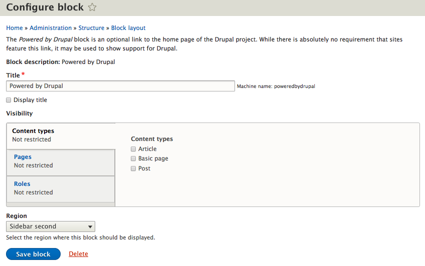 Block content, whether system generated or custom, can have its display title changed, displayed, and even suppressed. In the case of our Powered by Drupal block, we can change the title by simply inputting a different value in the Title field and enabling it to display.