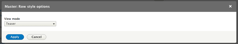 In addition to displaying the View row by field, you should also use entity view modes. This is useful to ensure consistency between Views and other displays of the entity. In order to enable this, select Content from the radio buttons for row style and click Apply. From there, you can select the view mode for the node. Select Teaser from this list to show each row using the Teaser view mode.