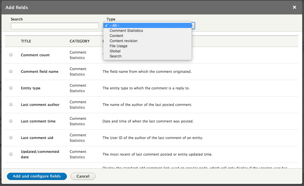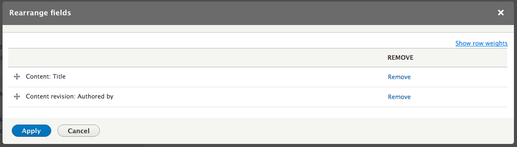 The order that the fields are listed in the View configuration determines the order they are output and adding a new field will place it at the end of the list. To change the order, open the drop-down next to the Fields and click Rearrange. From the dialog that appears we can drag the fields into the desired order. This dialog also allows us to remove fields from the display by clicking the Remove link next to the field: