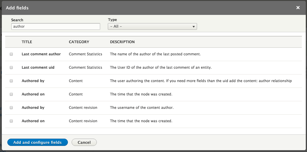 Imagine that, for our current list of articles, we want to display the author of the node as well. We can enter the term author in the search screen to find appropriate fields. There are a number of fields that show up. In this case we'll select the username of the author of the current node revision.