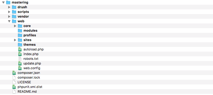 The new directory structure places everything related to Drupal within the /web folder, including the core, modules, profiles, sites, and themes. Drush and Drupal Console along with any dependencies that Drupal needs get installed within the /vendor folder. The remaining two folders /drush and /scripts are utilized by Drush and Drupal 8 to help configure our project.
