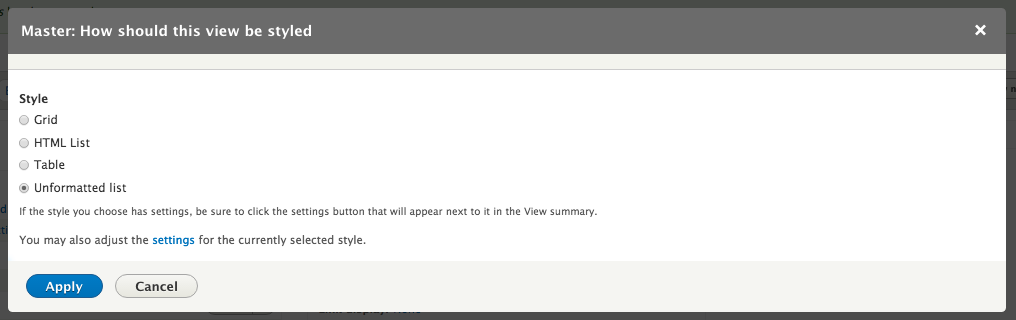 There are a number of options on how to present the rows loaded by the View. Each View format has a different set of options available and provides a very different output. You can change the format for the View by clicking on the link next to the label for Format showing the currently selected format: