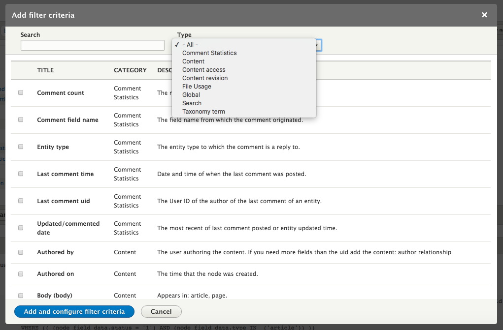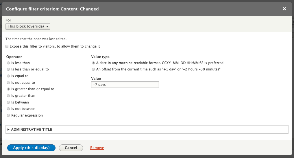 For instance, if we wanted to show a list of Articles that had been created or updated within the last week we would select Changed from the list of options and click Add and configure filter criteria.