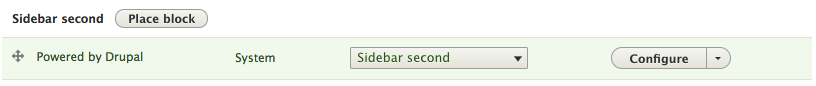 One common task we will find ourselves performing quite frequently is placing blocks into regions. This task is very simple and can be performed by scrolling down the Block layout page, locating the region where we want to place our block, and clicking on the Place block button.