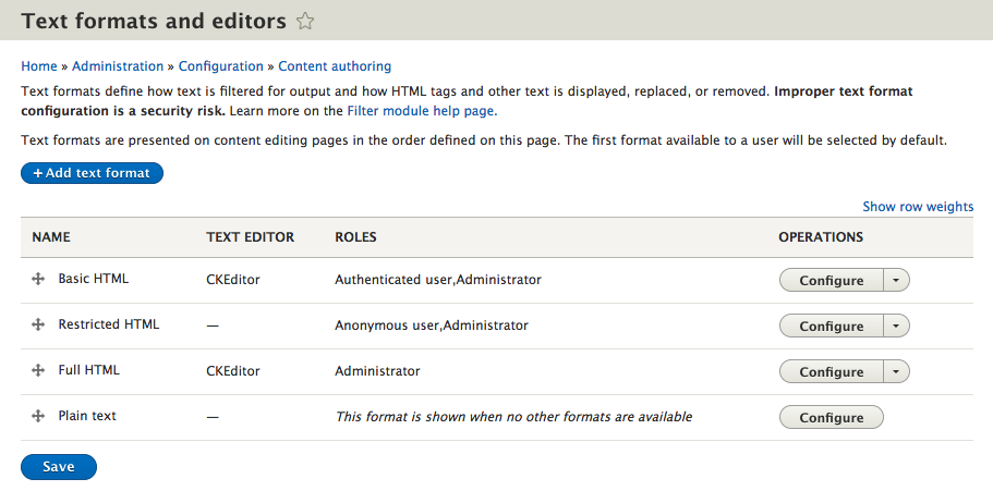 By default, Drupal has created and configured four different text formats for us to use: