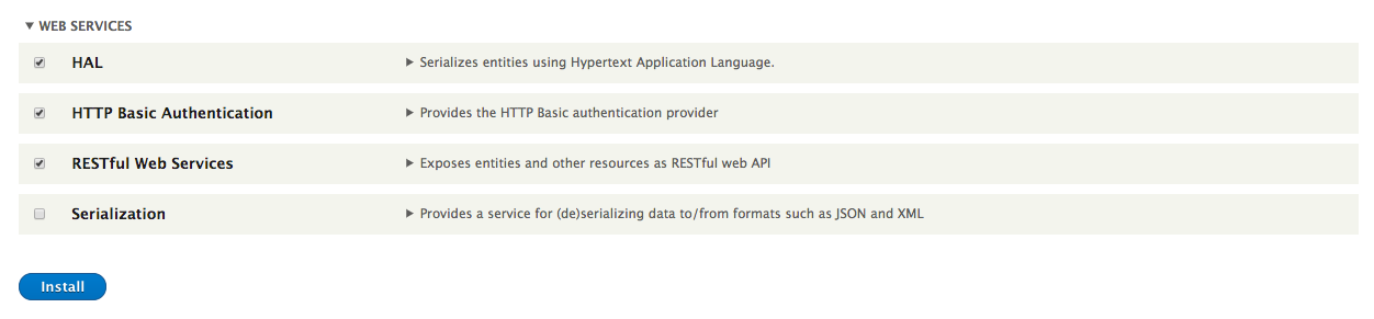 Since the core REST module is included in Drupal 8 core, enabling it is simply a matter of going to the Extend page, selecting the checkbox next to RESTFul Web Services and clicking the Install button. If you want to enable HAL JSON you'll also want to select the HAL module and the HTTP Basic Authentication module.