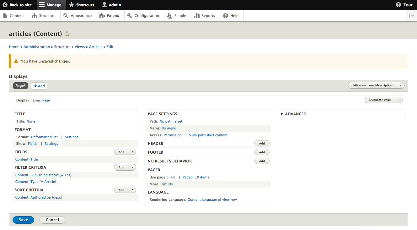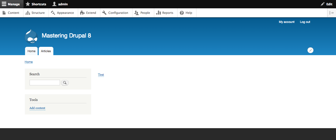 If we then navigate to the home page we will see a new link within the primary navigation for Articles that will display our View.