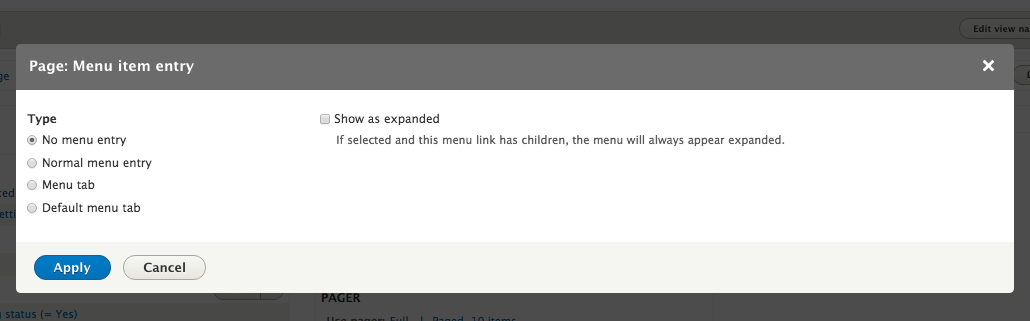 - Normal menu entry: The most common selection is Normal menu entry which adds a link within the selected menu tree. This allows us to place the View page within a menu structure, have it highlight the menu items that are the ancestors in the tree, as well as provide the correct Breadcrumbs.