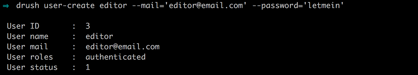 drush user-create editor --mail='editor@email.com' --password='letmein'
