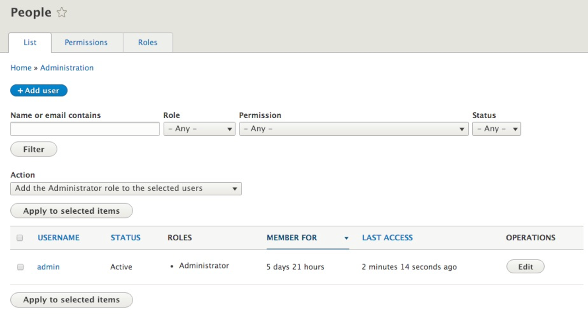 Managing users is an important part of any CMS, and Drupal is no different. Being able to quickly glance at a list of users along with their status and roles can help a site admin know which users have an account and what are their limitations. The process of managing users begins with People.