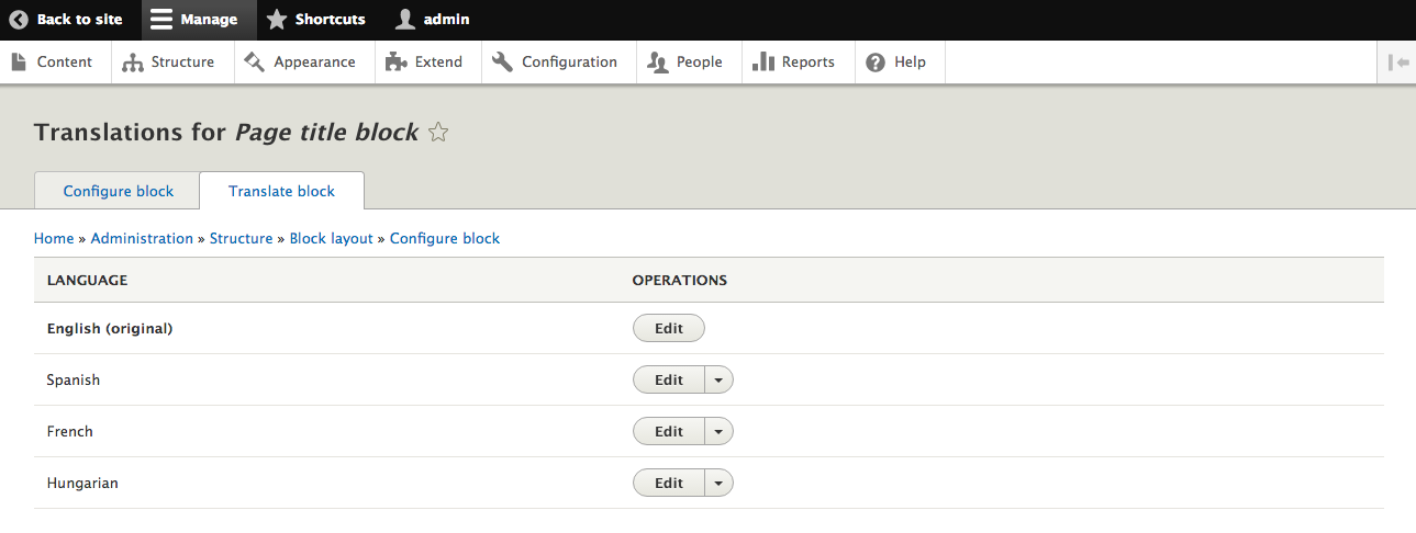 After clicking the Translate button next to the Block, you are able to Add, Edit, or Delete translations for any text elements exposed by the Block.