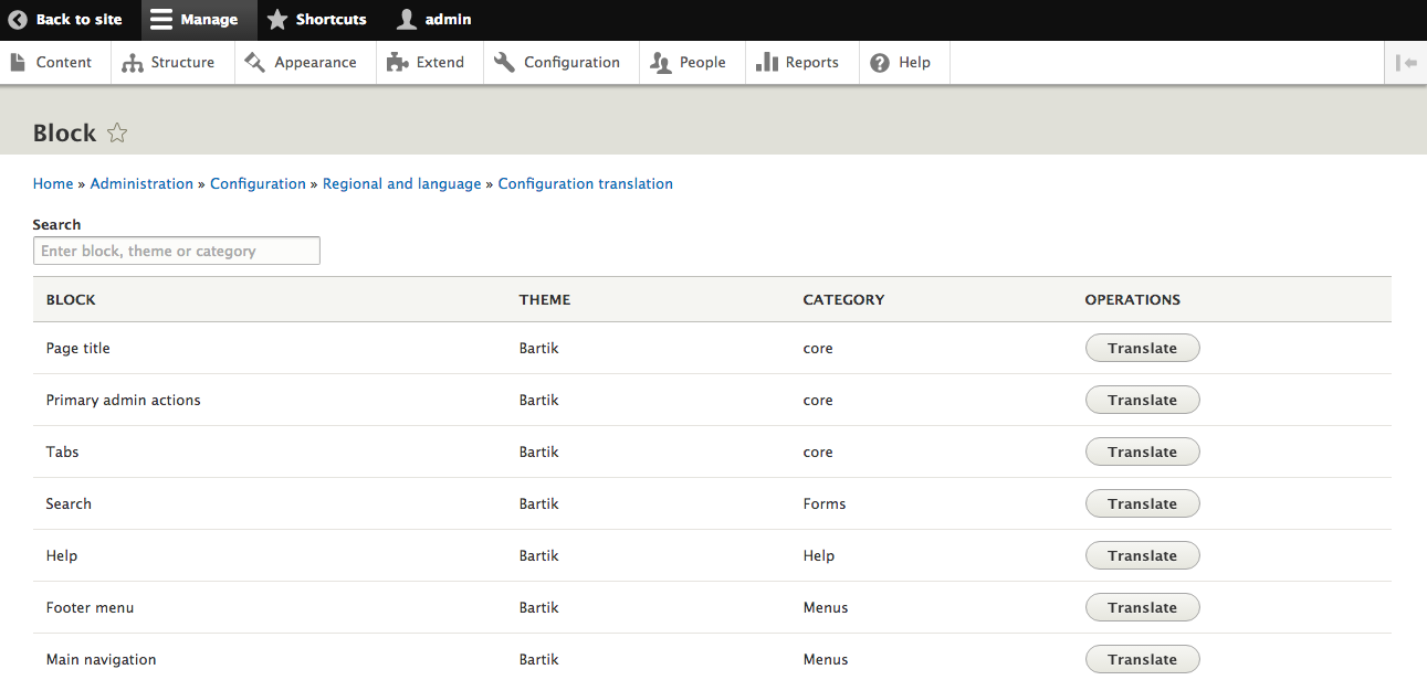 Each configuration object or type is displayed in a list with a button to either Translate the object or list the objects of that type. For instance, clicking on List next to Block shows a list of all Blocks with the ability to translate the values for each one.