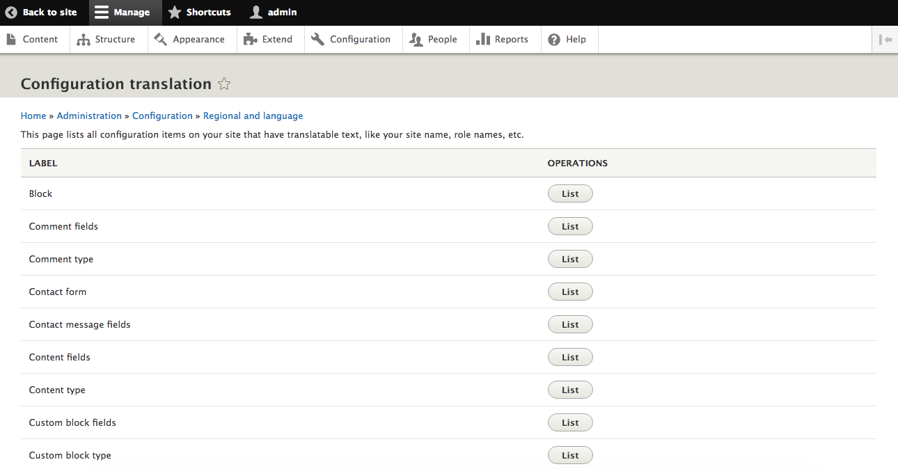 All of the configuration elements can be accessed for translation by selecting Configuration and then Configuration translation from the menu bar, or by navigating to admin/config/regional/config-translation.