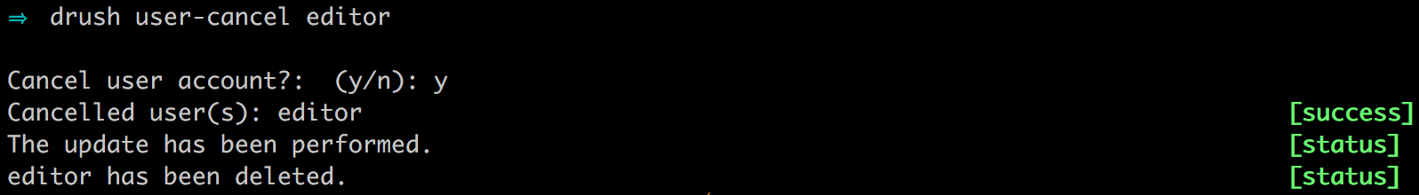 To cancel a user account, all we need to know is the name of the user, which is the equivalent to the username for the account, and the drush user-cancel command.