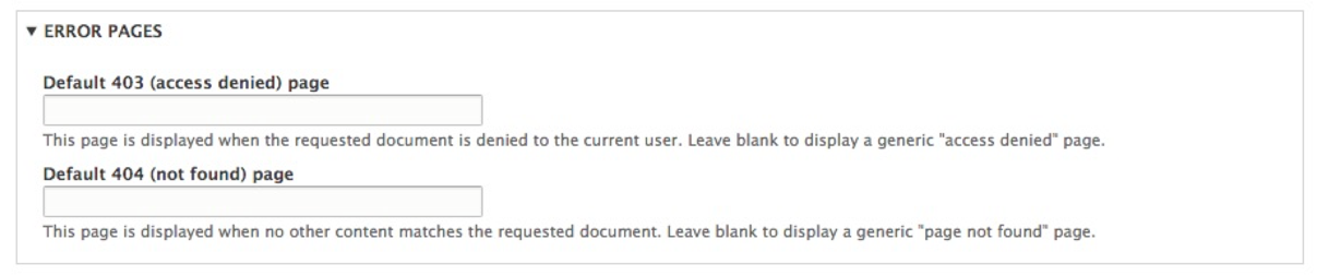 When either an access-denied or page-not-found error is triggered by Drupal, it is helpful if we specify a specific node or page that contains additional information for our user. This can easily be accomplished using these two fields.