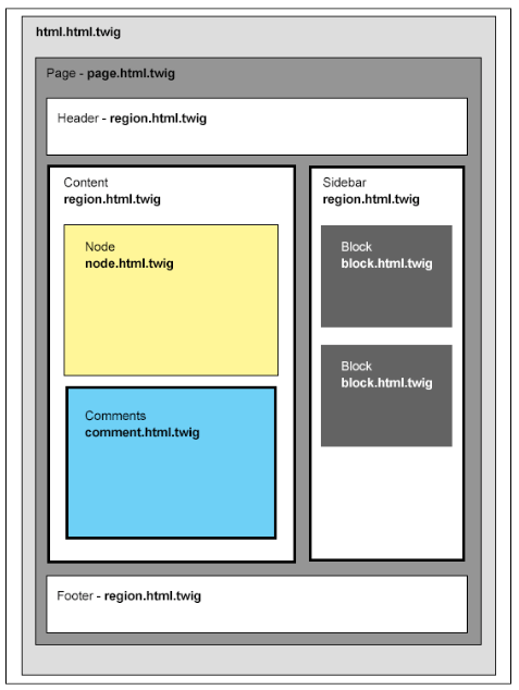 - Content: This is also considered a region, generally containing our main content. This can consist of multiple subcontent regions, such as nodes and comments. Nodes and comments each have their own respective templates referred to as node.html.twig and comment.html.twig.