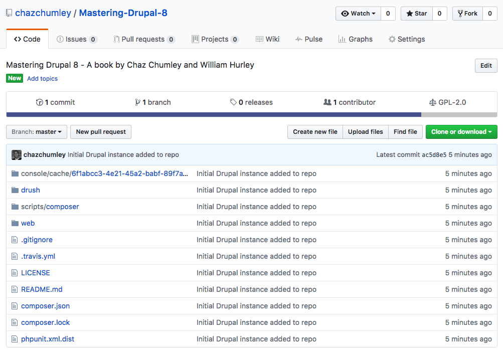 If we navigate to GitHub, we will now see that our once-empty repo contains the Drupal 8 instance that we added locally: