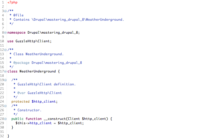 The Drupal Console has also created the initial stub of the service file at /modules/custom/mastering_drupal_8/src/WeatherUnderground.php.