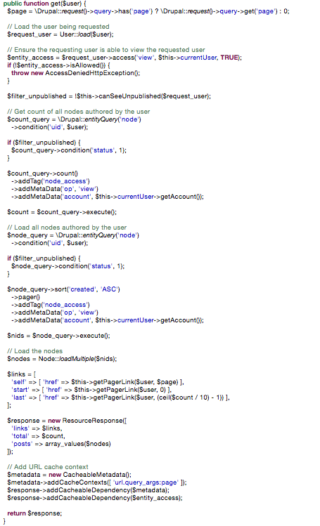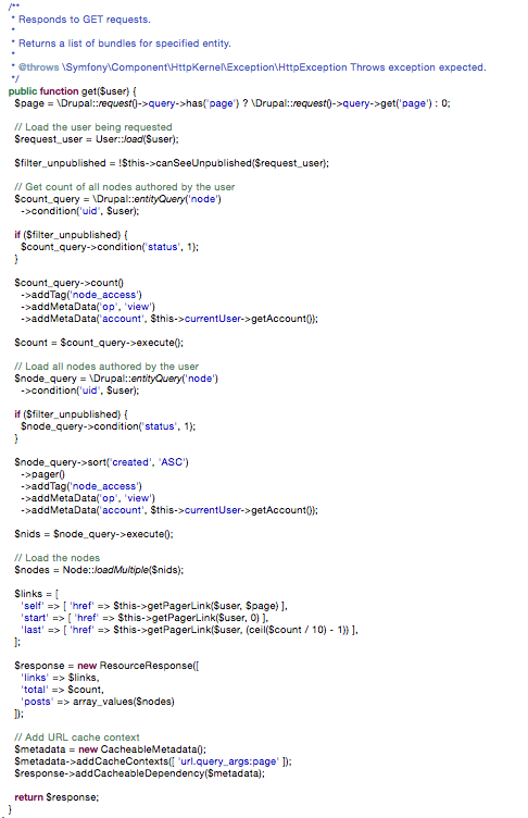 Now we have a robust way of retrieving all nodes authored by a given user. It has pagination and allows traversal through the API. It also has security in place to ensure that the user who requests the list is able to view the user in question, as well as all nodes that might be returned. It also respects all the authentication methods available in both core and contrib. In the end, your get() function should look like this: