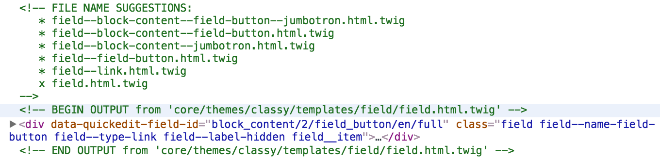 Each field that Drupal displays also has a field.html.twig template that it uses. We can override this template like we did with both the Node and Block templates. All we need to do is identify the path and the filename suggestion to use.