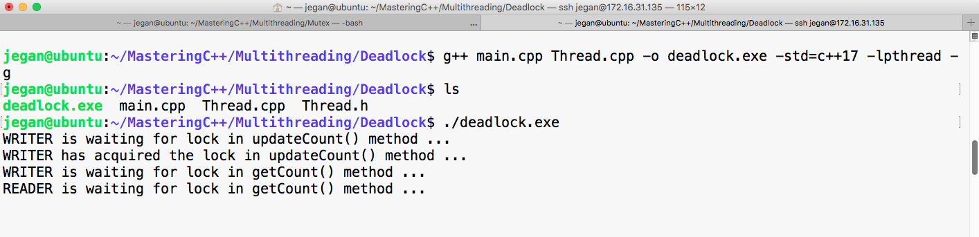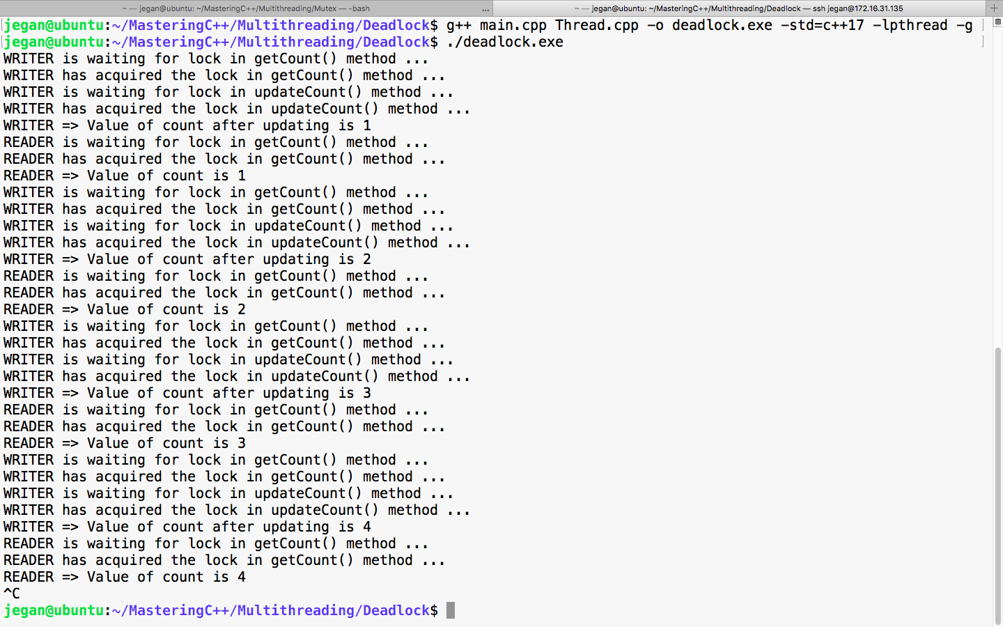 From the output's screenshot, it is evident from the print statements that the Thread::updateCount() method has acquired the lock first and has then invoked the Thread::getCount() method. But since the Thread::updateCount() method hasn't released the mutex lock, there is no way for the Thread::getCount() method invoked by the WRITER thread to proceed. Meanwhile, the OS scheduler has started the READER thread, which seems to wait for the mutex lock acquired by the WRITER thread. Hence, for the READER thread to complete its task, it has to acquire the lock on the Thread::getCount() method; however, this isn't possible until the WRITER thread releases the lock. To make things even worse, the WRITER thread can't complete its task until its own Thread::getCount() method call completes its task. This is what is called a deadlock.