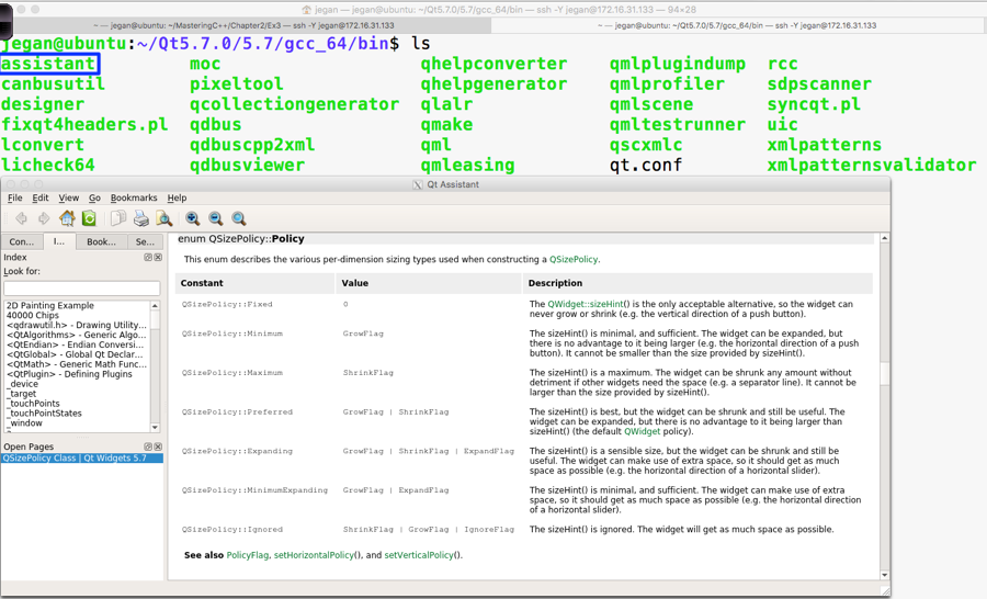 In the highlighted section, we have overridden the default size policy of all the buttons. In line number 27, the first parameter QSizePolicy::Expanding refers to the horizontal policy and the second parameter refers to the vertical policy. To find other possible values of QSizePolicy, refer to the assistant that comes in handy with the Qt API reference, as shown in the following screenshot: