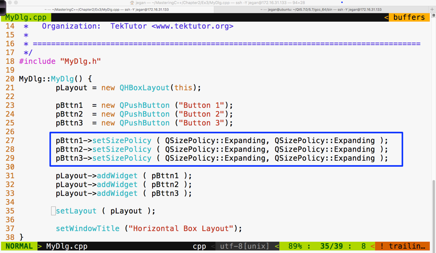 As you can see in the preceding screenshot, we defined the MyDlg constructor and instantiated the layout and the three buttons. In lines 27 through 29, we added three buttons to the layout. In line number 31, we associated the layout to our dialog. That's all it takes. In the following screenshot, we defined our main function, which creates an instance of QApplication: