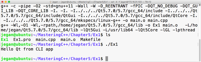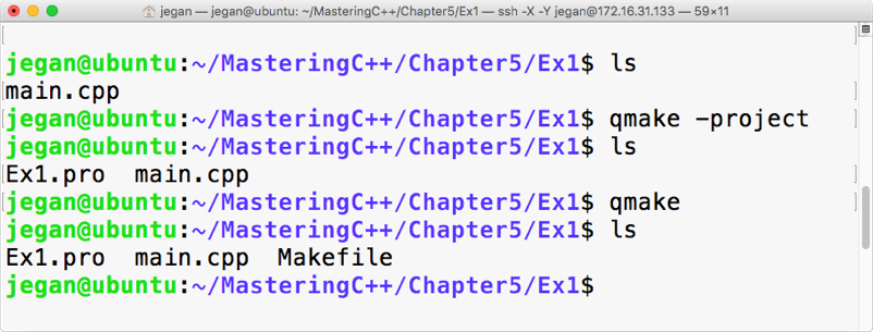 Now it's time to create Makefile taking Ex1.pro as an input file. As the Ex1.pro file is present in the current directory, we don't have to explicitly supply Ex1.pro as an input file to autogenerate Makefile. The idea is that once we have a .pro file, all we would need to do is generate Makefile from the .pro file issuing command: qmake. This will do all the magic of creating a full-blown Makefile for your project that you can use to build your project with the make utility, as shown in the following screenshot: