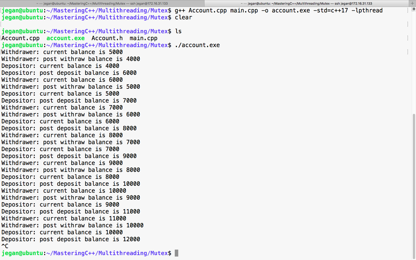 As you can see, there are two critical section blocks in the threadProc function, so it is important to understand that only one thread can enter the critical section. For instance, if the depositor thread has entered its critical section, then the withdrawal thread has to wait until the depositor thread releases the lock and vice versa.