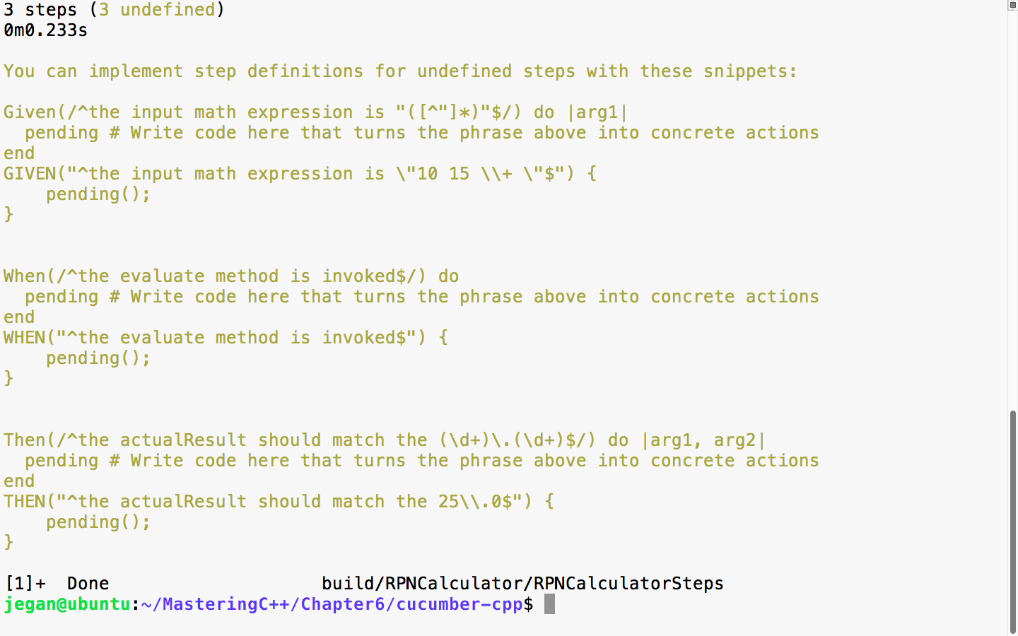 As we are yet to implement the RPNCalculatorSteps.cpp file, the Cucumber framework is suggesting us to supply implementations for the previous steps. Let's copy and paste them in the RPNCalculatorSteps.cpp file and complete the steps implementations, as follows: