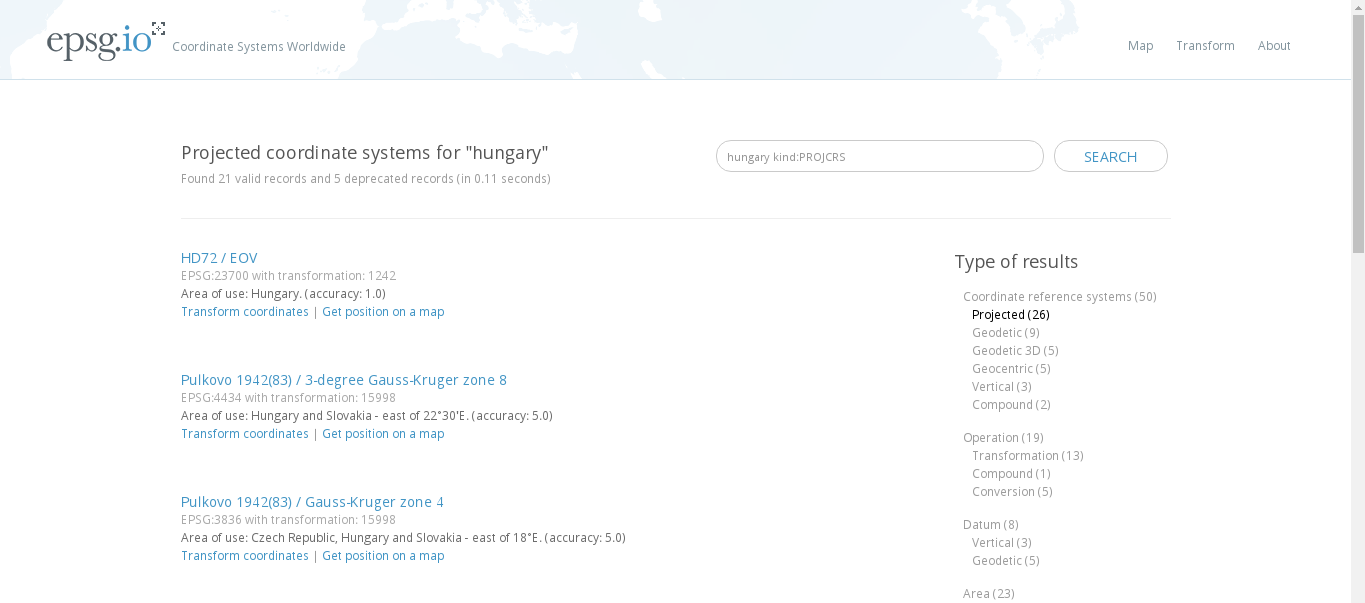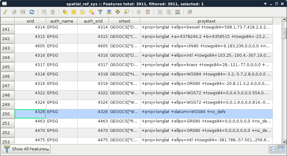 Appendix 1.4: Some of the Coordinate Reference System's PostGIS support. The selected one is the EPSG:4326 CRS used by the book in the early chapters: