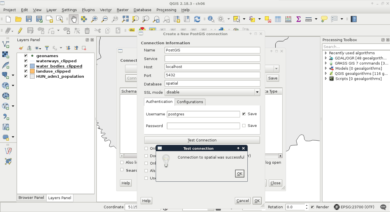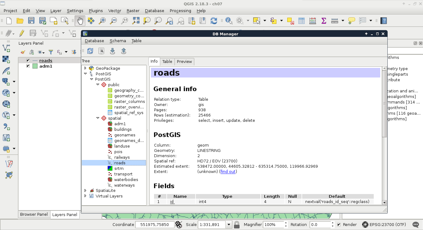 Chapter 6, Feeding a PostGIS Database, guides you through the process of making a spatial database with PostGIS. It discusses how to create a new database, and how to fill it with various kinds of spatial data using QGIS. You will also learn how to manage existing PostGIS tables from QGIS.
