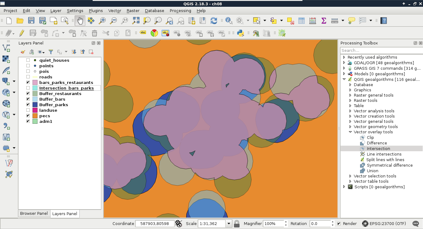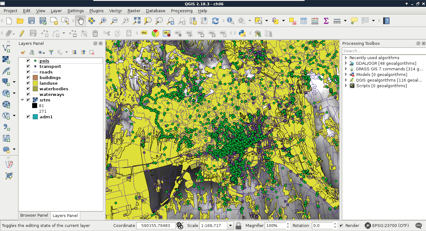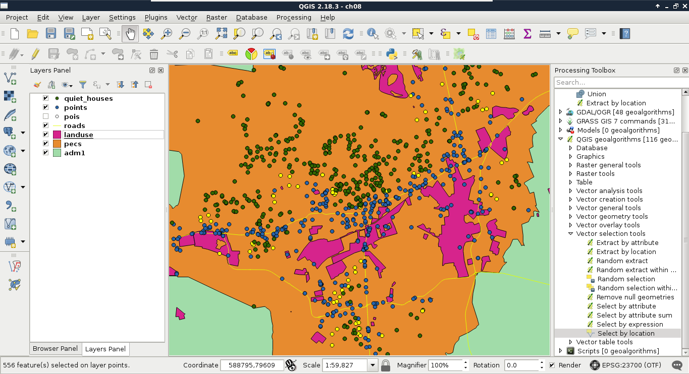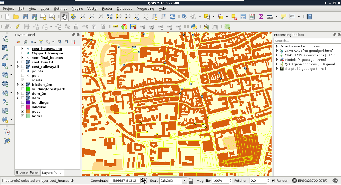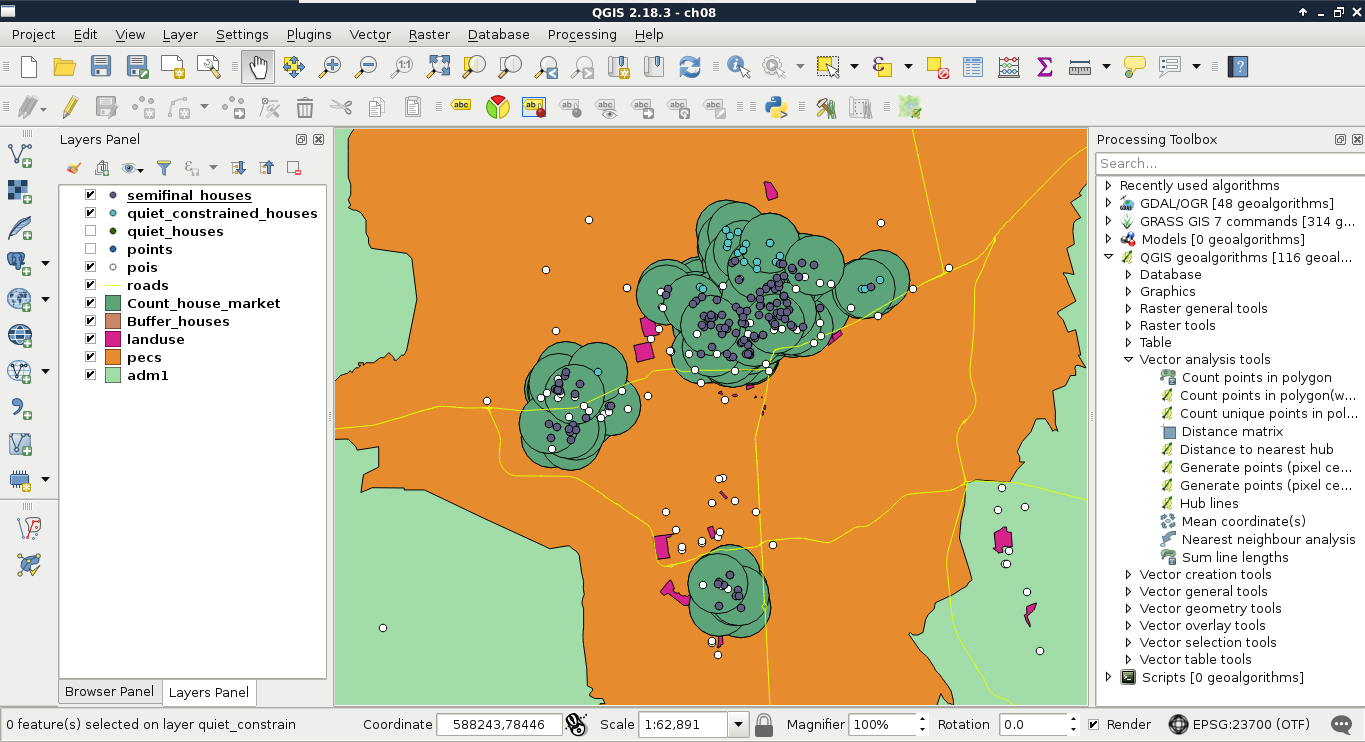 Chapter 8, Spatial Analysis in QGIS, goes back to QGIS in order to discuss vector data analysis and spatial modeling. It shows you how different geometry types can be used to get some meaningful results based on the features' spatial relationship. It goes through the practical textbook example of delimiting houses based on some customer preferences.