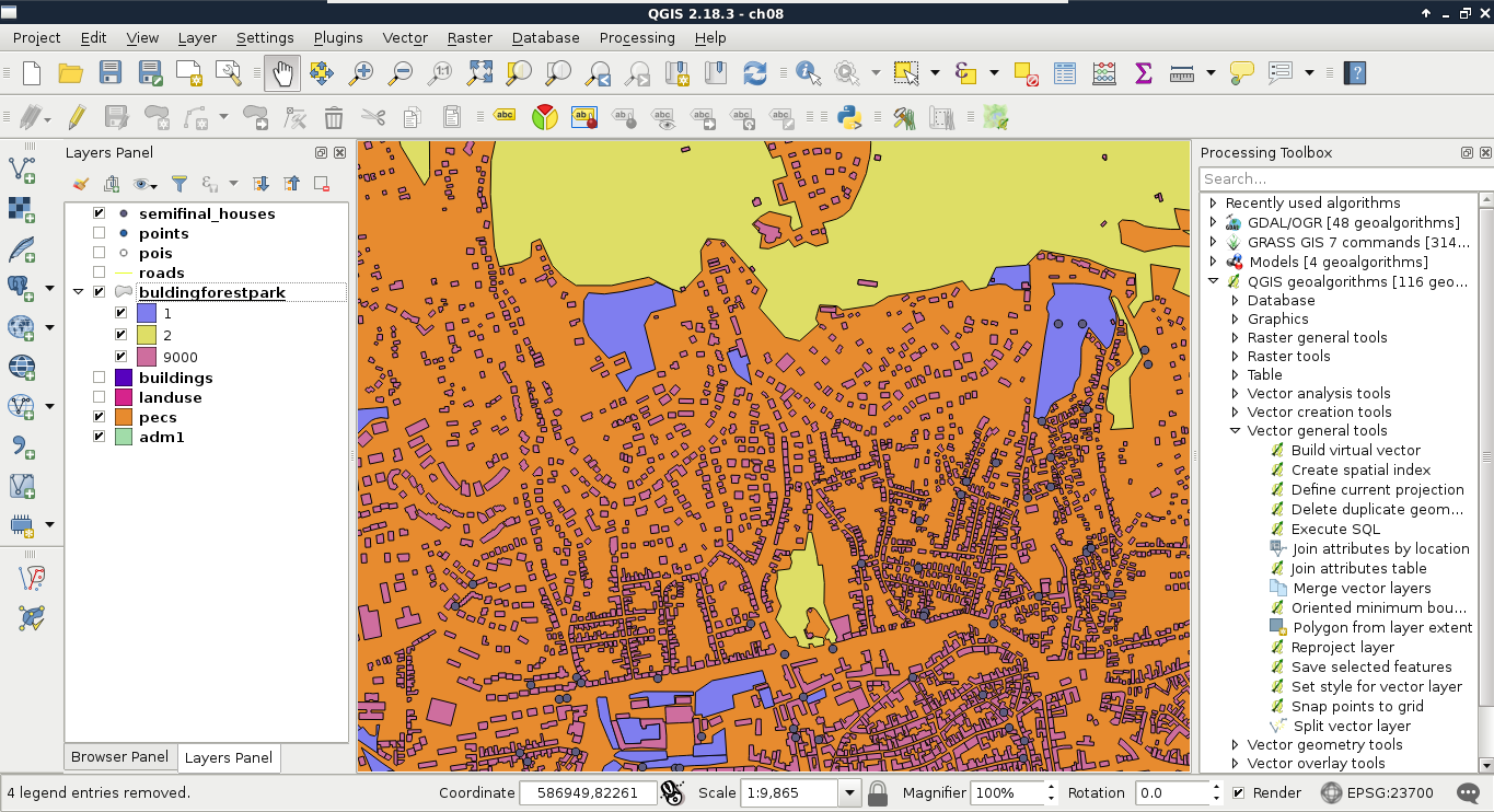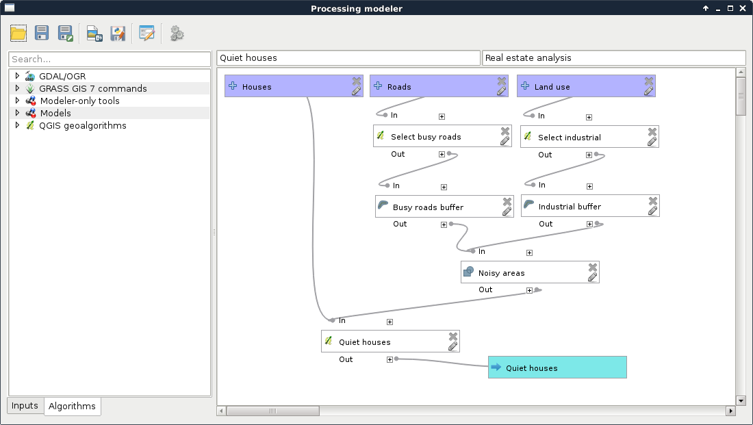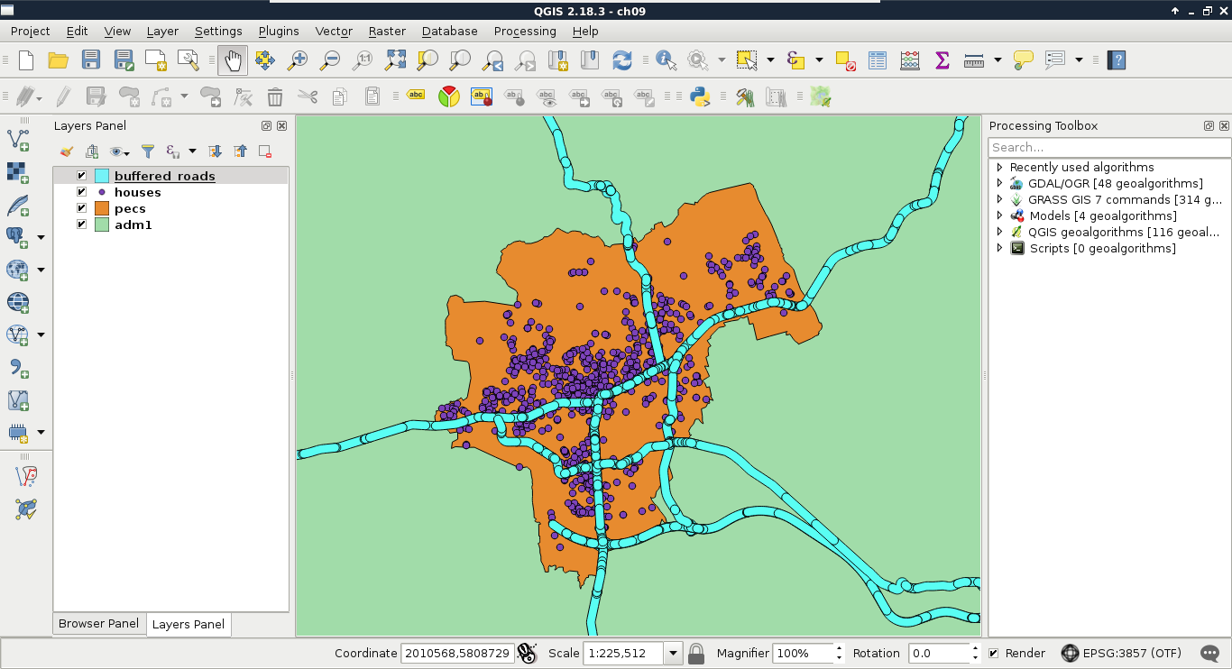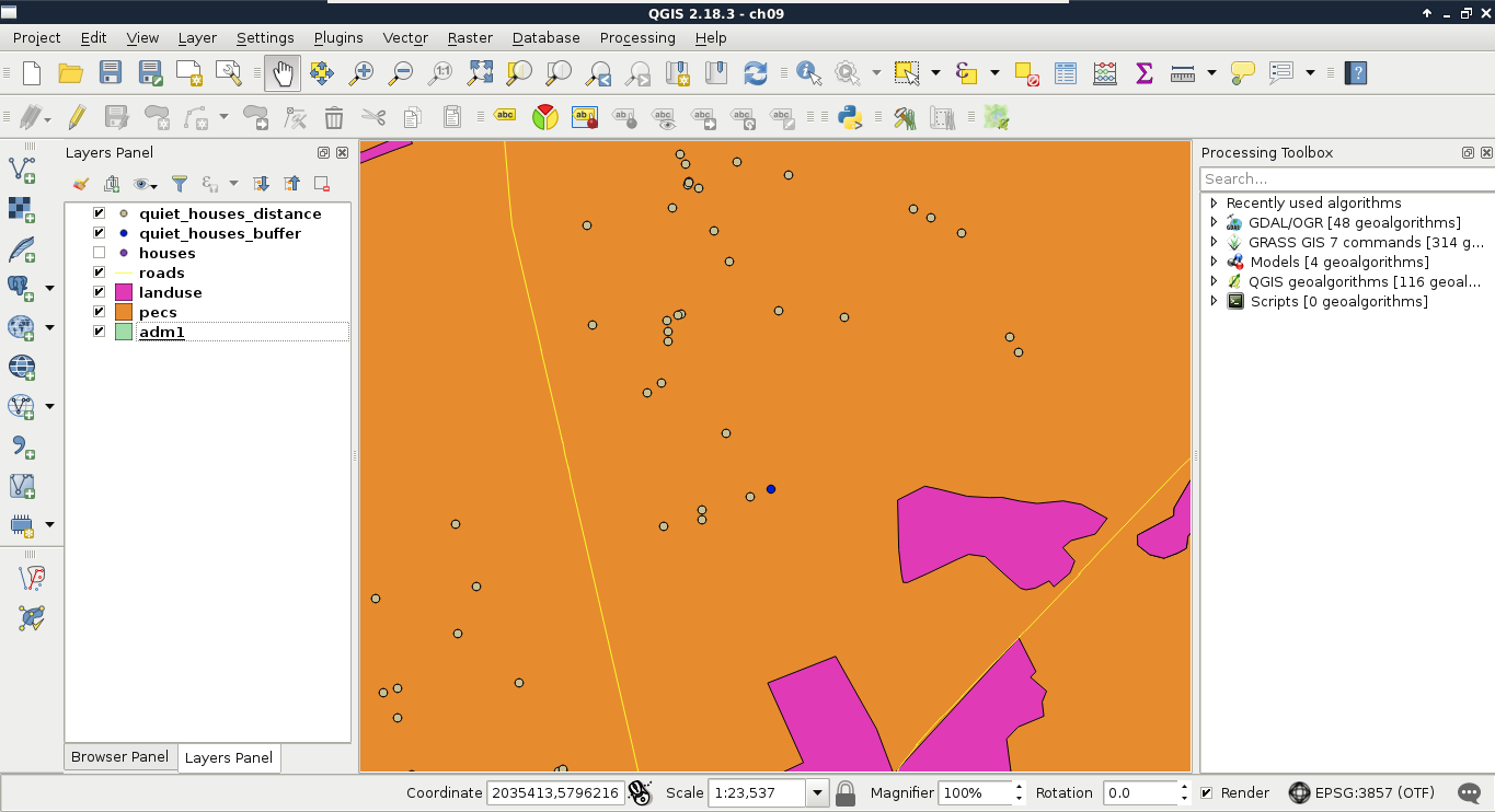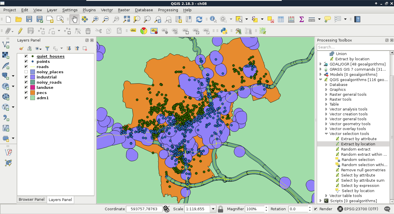 Chapter 8, Spatial Analysis in QGIS, goes back to QGIS in order to discuss vector data analysis and spatial modeling. It shows you how different geometry types can be used to get some meaningful results based on the features' spatial relationship. It goes through the practical textbook example of delimiting houses based on some customer preferences.