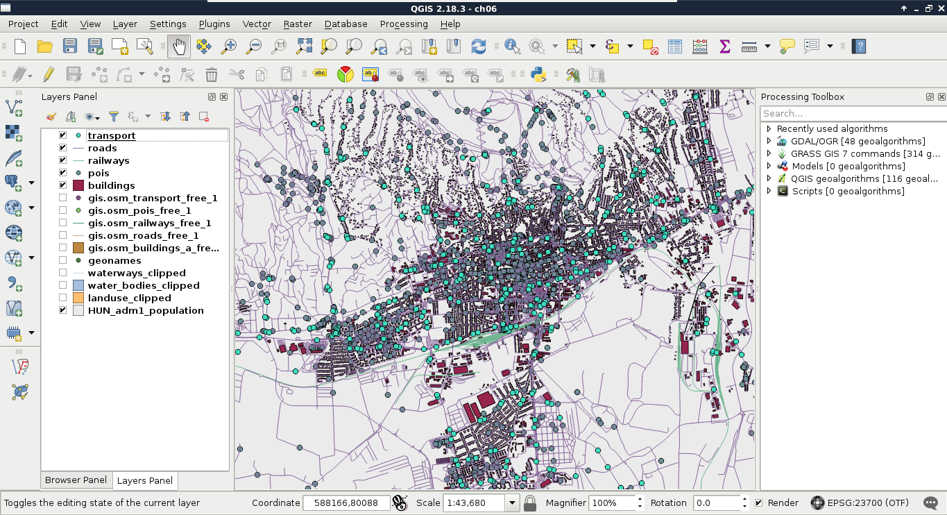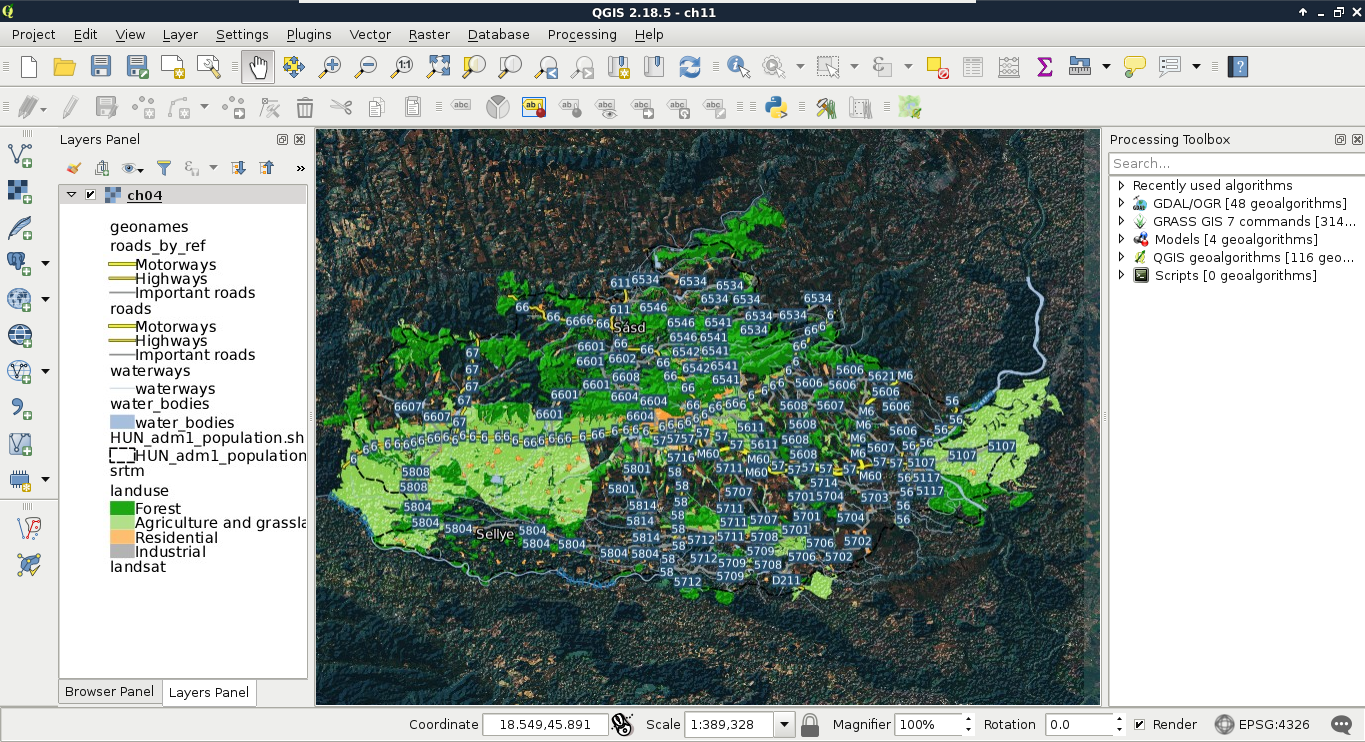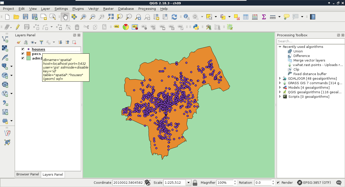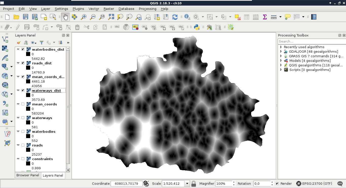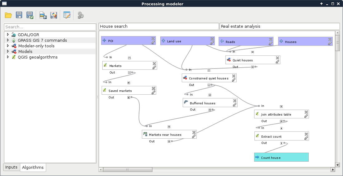 Chapter 8, Spatial Analysis in QGIS, goes back to QGIS in order to discuss vector data analysis and spatial modeling. It shows you how different geometry types can be used to get some meaningful results based on the features' spatial relationship. It goes through the practical textbook example of delimiting houses based on some customer preferences.