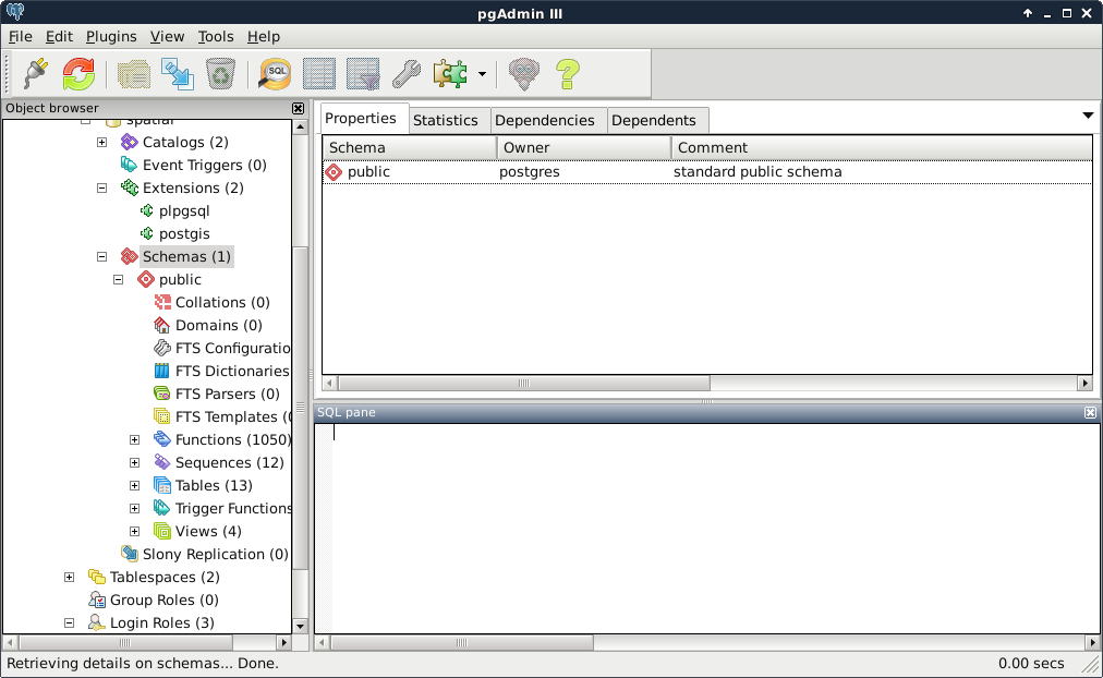 The next piece of software we look at is PostGIS via pgAdmin. If we open pgAdmin, the least we will see is an empty Server Groups item on the left panel. If this is the case, we have to define a new connection with the plug icon and fill out the form (Object | Create | Server in pgAdmin 4), as follows: