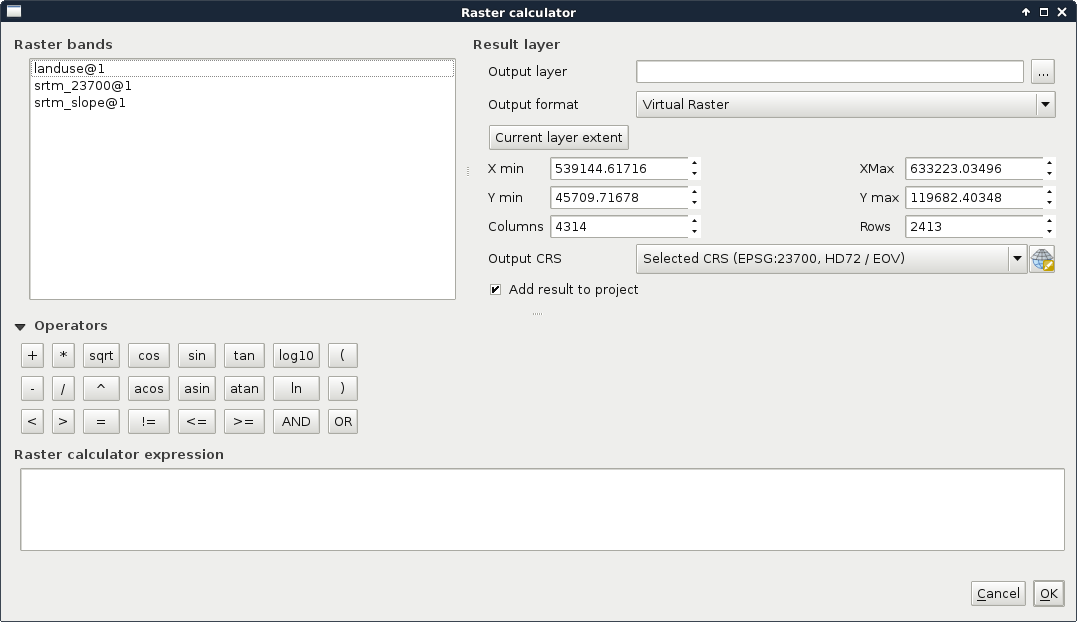 The natural number e is not included in QGIS's raster calculator, although, similarly to π, it can be hard coded as 2.7182: