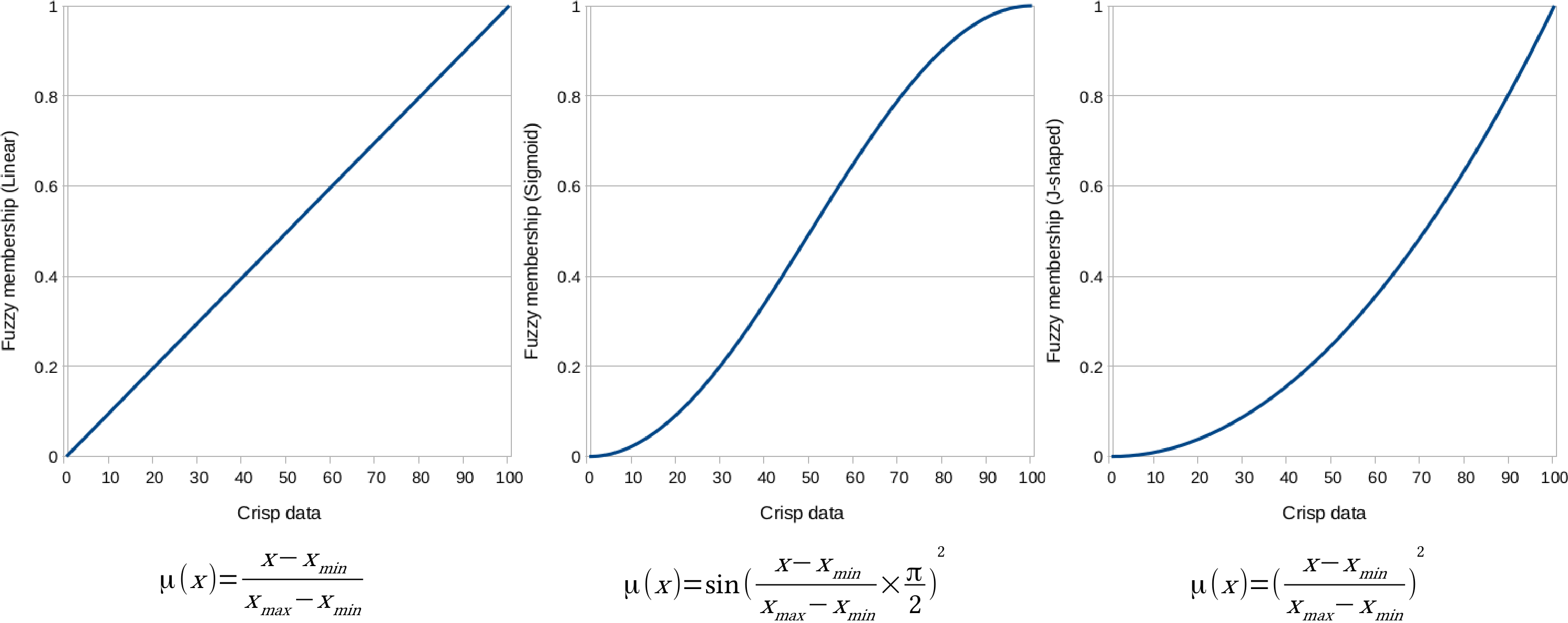 Appendix 1.14: Other popular fuzzy membership functions. Some of them are similar to the ones described in Chapter 10, A Typical GIS Problem, although with slightly different shapes and different formulas. The formulas were created with the assumption that the whole data range is fuzzified. If not, cell values below or above the threshold should be handled. In the formulas, variables denoted with m are break points or turning points, while variables denoted with s are defining the shape of the functions.