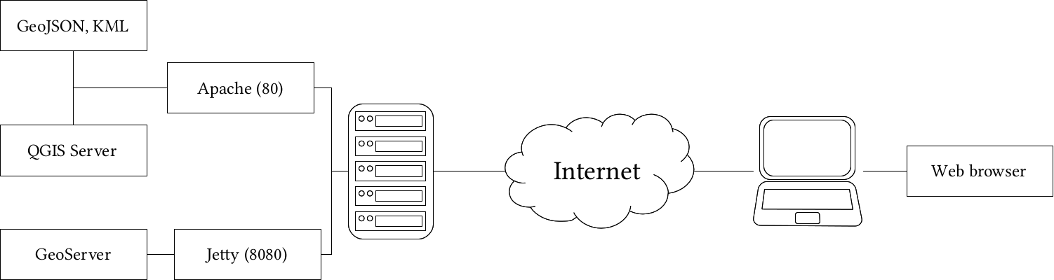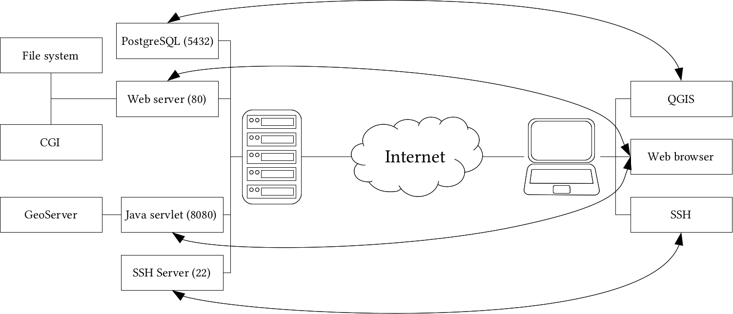 Appendix 1.16: A server machine hosting two web servers (one for running Java web applications), a PostgreSQL database, and an SSH server. Clients can query those servers with the appropriate client-side applications: