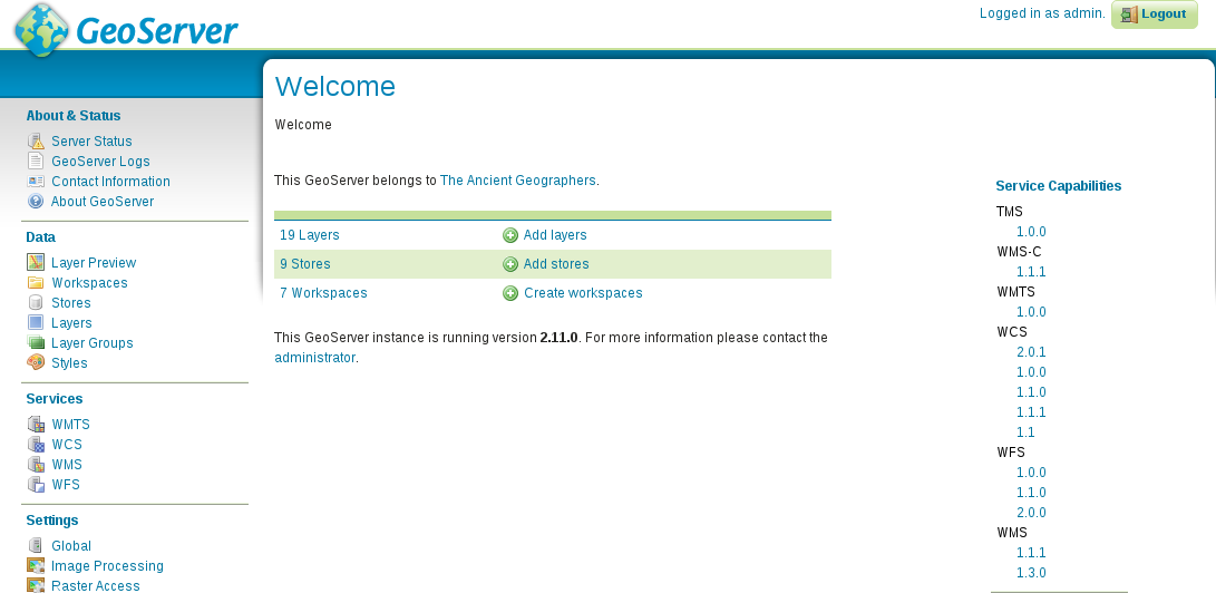 After all things are set, we can proceed and install the required packages. The order should not matter. If done, let's take a look at GeoServer, which doesn't offer Linux packages to install. It offers two methods for Linux: a WAR for already installed Java servlets (such as Apache Tomcat), and a self-containing platform independent binary. We will use the latter as it's easier to set up:
