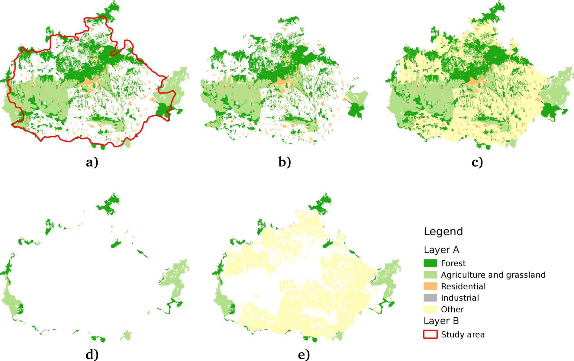 Appendix 1.3: Some of the basic geoalgorithms visualized. a: the two input layers (A and B per GRASS's v.overlay), b: clip (and), c: union (or), d: difference (nor), e: symmetrical difference (xor):